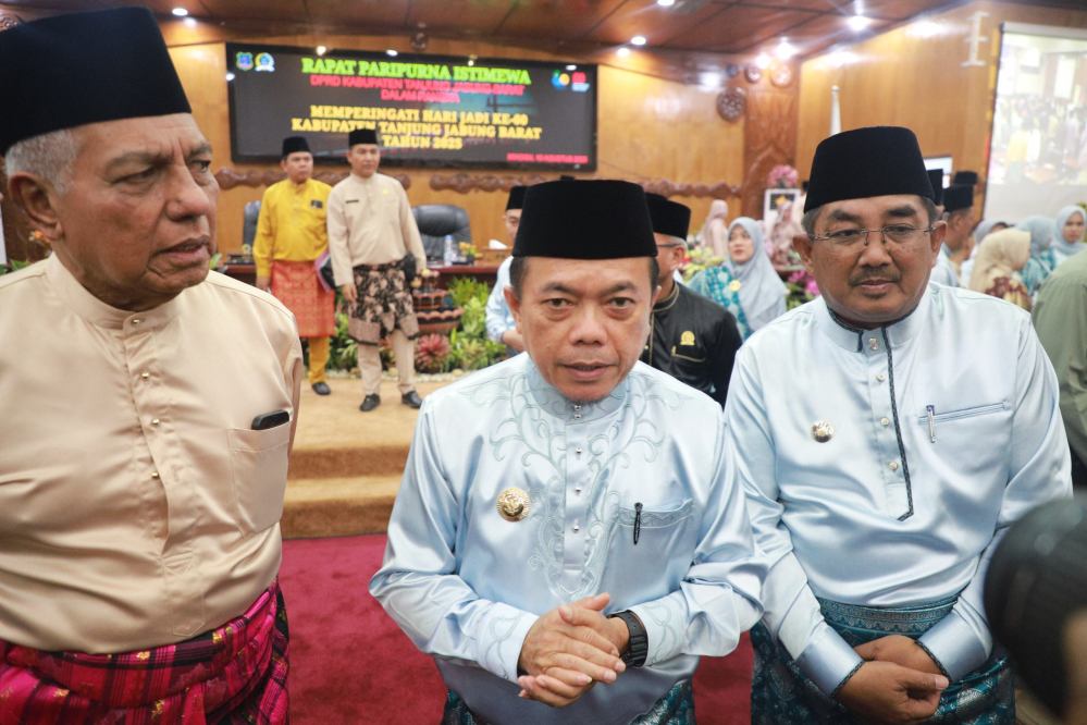 Hadir pula Ketua TP PKK Provinsi Jambi Hj. Hesnidar Haris, Ketua TP PKK Kabupaten Tanjab Barat Hj. Fadillah Sadat, dan Ketua GOW Tanjab Barat Marina Septiani Katamso, dan Ketua DWP Karolin HAT Hermansyah. Rapat paripurna yang dipimpin oleh Ketua DPRD Tanjab Barat Hamdani, SE, diawali dengan menyanyikan lagu Indonesia Raya, dilanjutkan dengan pidato dari Ketua DPRD Kabupaten Tanjung Jabung Barat, serta penayangan video prestasi Pemerintah Daerah Kabupaten Tanjab Barat dan para atlet dari Kabupaten Tanjung Jabung Barat. Dalam sambutannya, Bupati Tanjung Jabung Barat, Drs. H. Anwar Sadat, M.Ag. menyampaikan pesan penting dalam rangka memperingati hari jadi ke-60 Kabupaten Tanjung Jabung Barat dengan Tema “Bersatu Wujudkan Tanjung Jabung Barat Berkah Madani” Serta mengajak seluruh elemen masyarakat untuk menjadikan momentum hari jadi sebagai refleksi perjuangan para pendahulu sekaligus memperkuat komitmen membangun daerah dengan semangat kebersamaan. “Tema tahun ini, “Bersatu Mewujudkan Tanjung Jabung Barat Berkah Madani” ini bukan sekadar slogan, tetapi arah pembangunan yang mengandung nilai Berkualitas, Ekonomi maju, Religius, Kompetitif, Aman, Harmonis, Mandiri, dan Inovatif (BERKAH MADANI)” ujarnya.